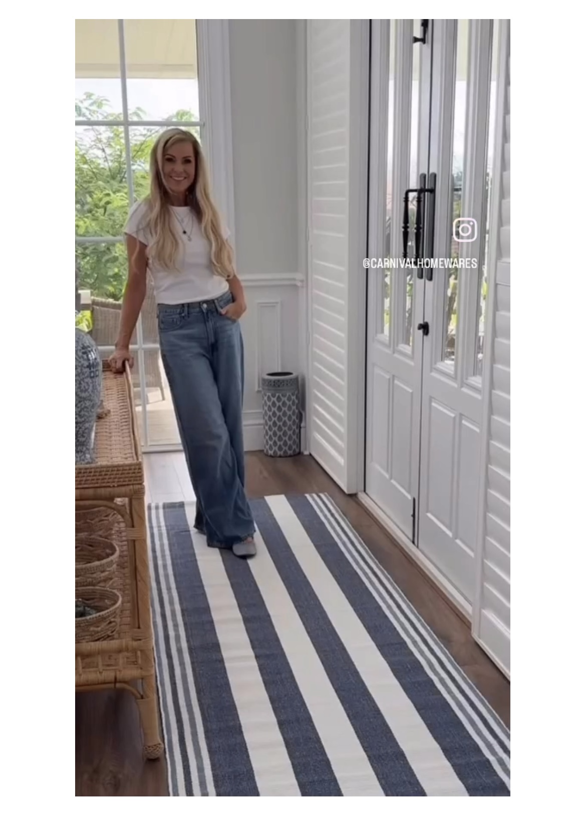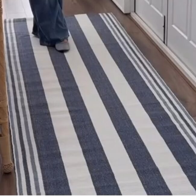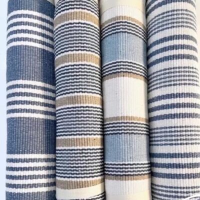 Woven from recycled cotton on traditional looms, it features relaxed coastal blues and soft natural tones in a timeless stripe. The texture is warm and lived-in, with subtle shifts that catch the light just enough. Whether styled in an airy hallway, layered in a casual living space, or grounding a sunroom, it feels considered, never forced.